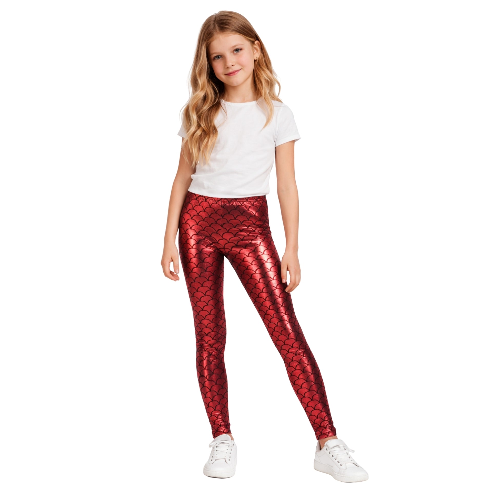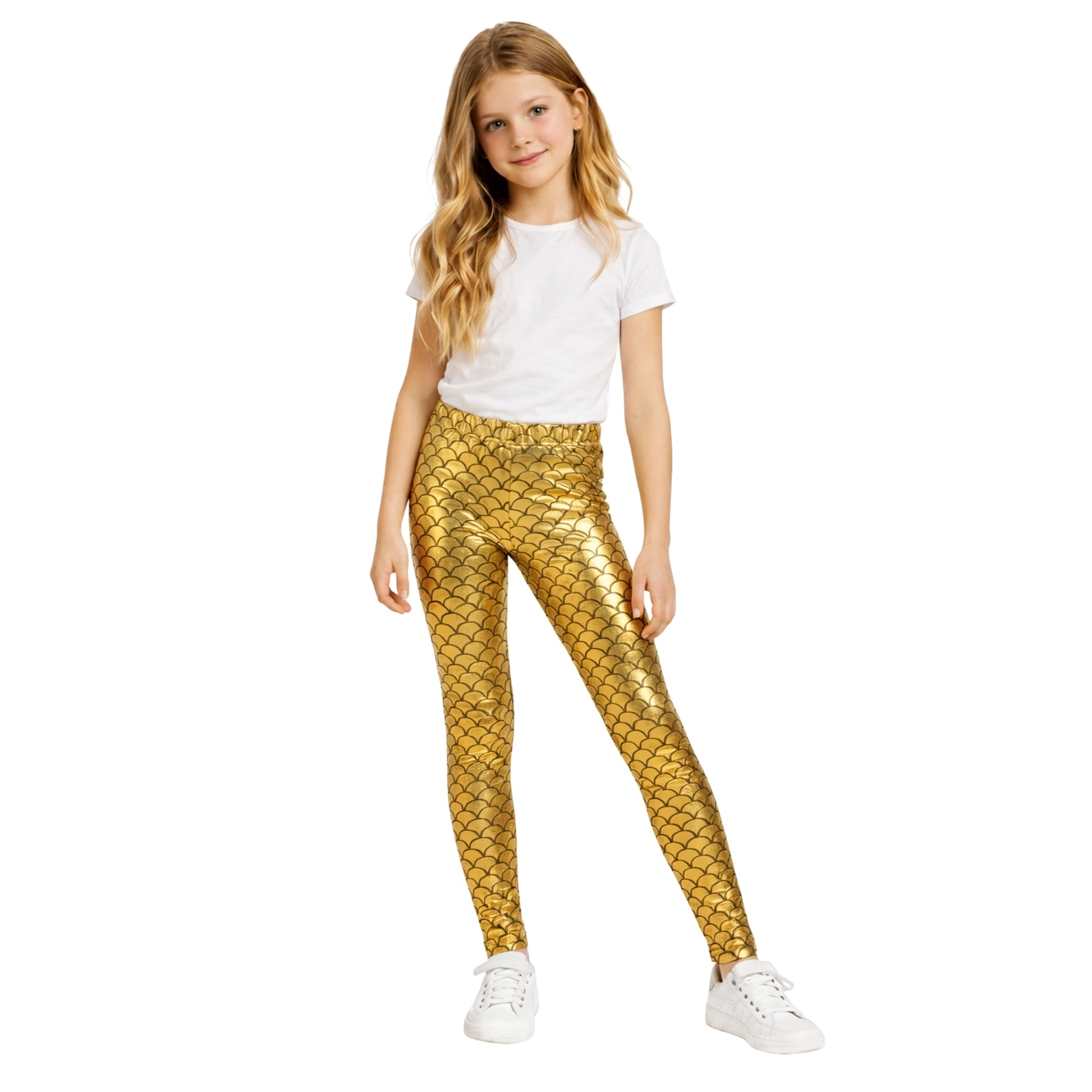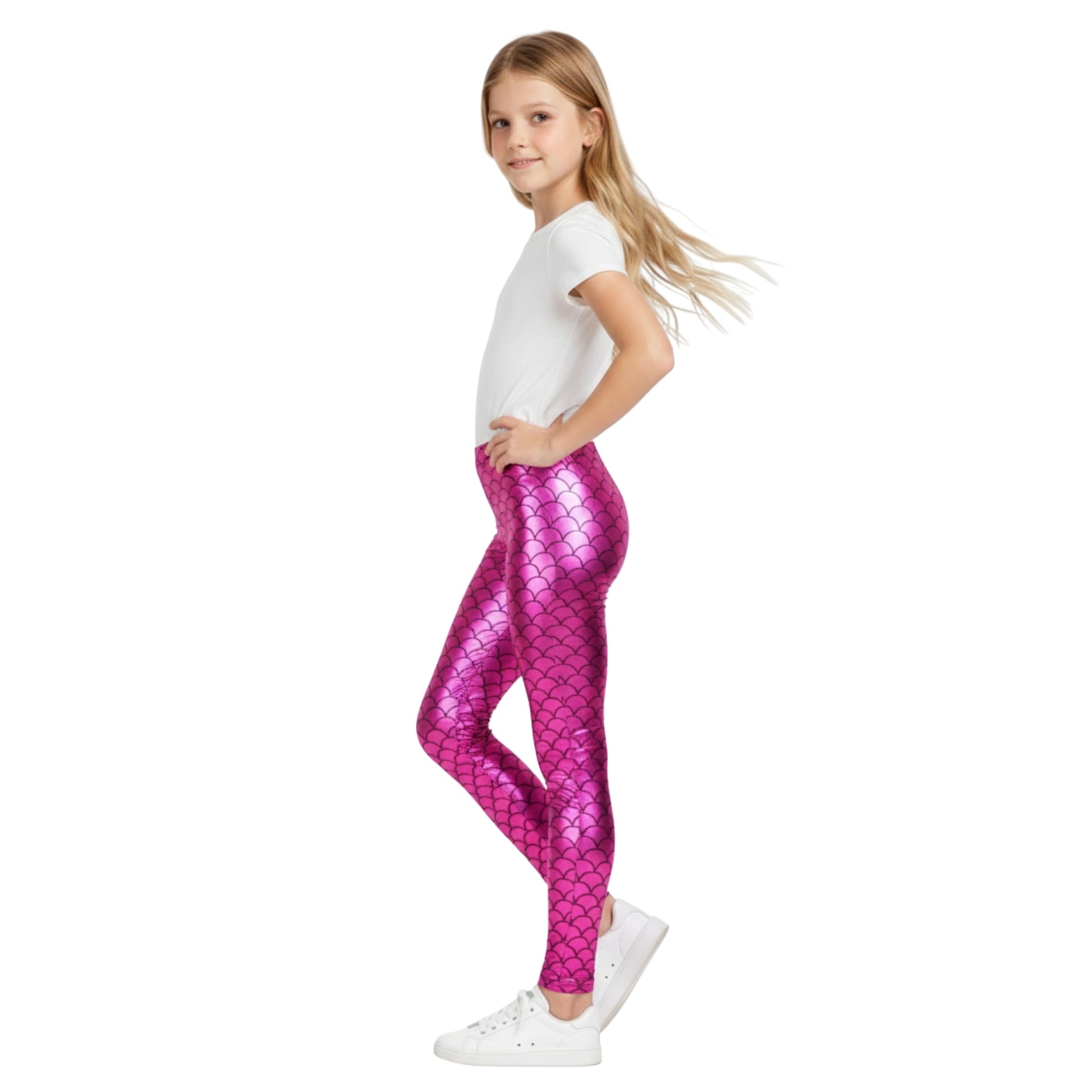 Mermaid-Inspired Metallic Design: Eye-catching leggings with a shimmering mermaid-scale effect in metallic fabric, creating a magical and playful look.
